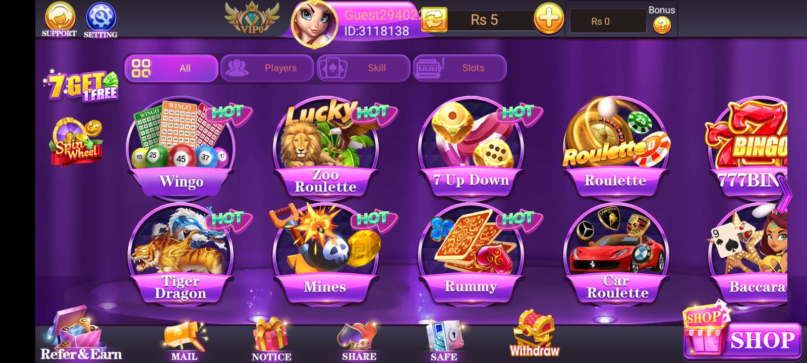 Players receive daily login bonuses, spin rewards, and referral commissions. You can also earn cash by inviting friends to join through your referral link.