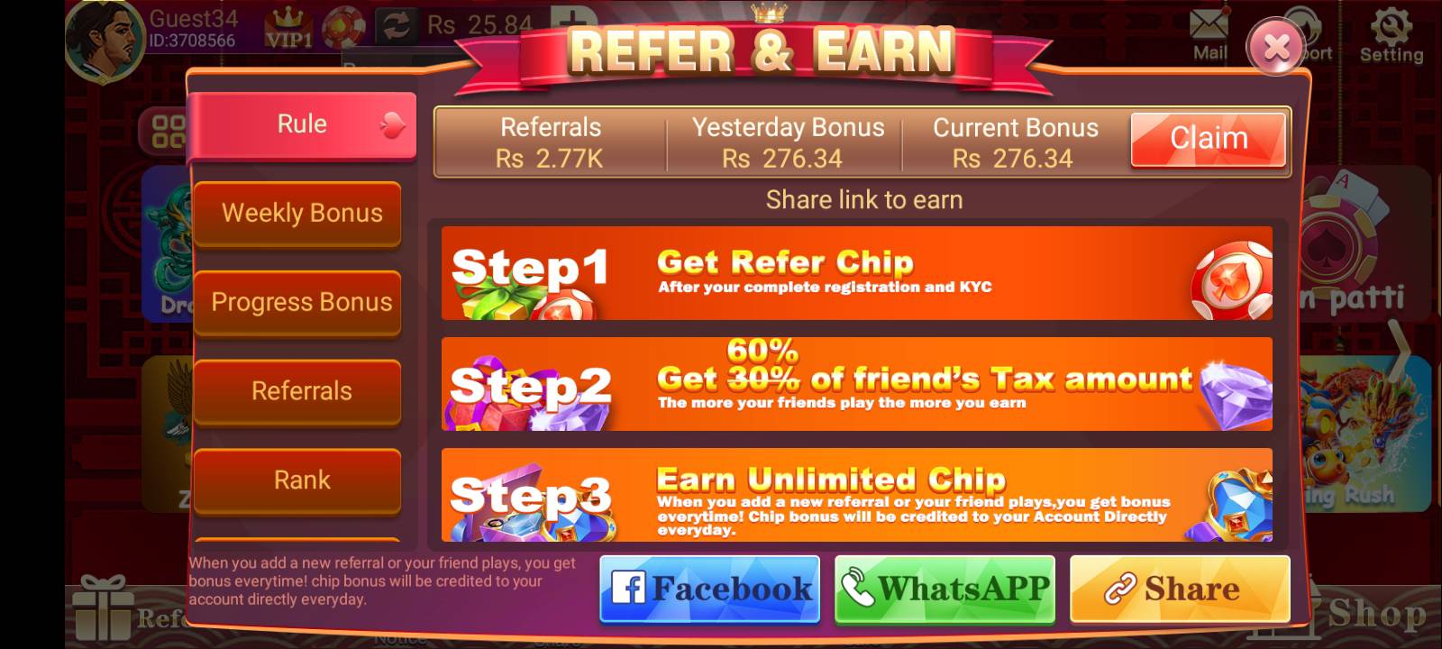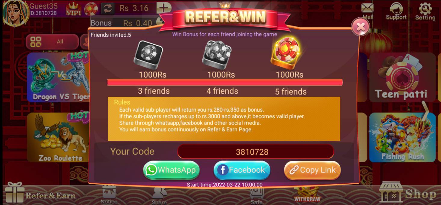 You can choose from Teen Patti, Dragon vs Tiger, Mines, and Rummy. Each game has different winning methods and offers real cash rewards. The more you play and win, the higher your income potential.